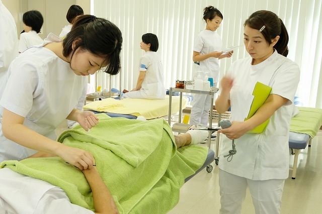 そして、ここから写真を漁っていたら、3年生の卒業実技試験(灸)の写真が。アリサが施灸中。おっ、奥にタマちゃん。ちなみに渡邉美恵子学科長代行が評価者やってます。