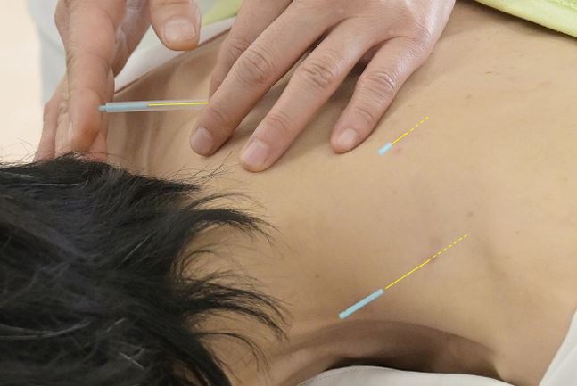 見やすさ&イメージしやすいように、鍼体(体に刺さる針金)を黄色の線で、刺さっている部分の黄色の点線であらわしています。