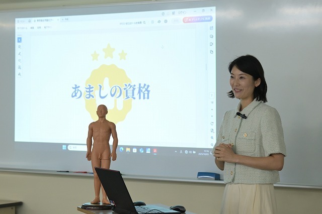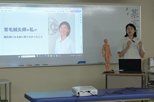 明世ちゃんが体験入学に来てくれました。いや、今をときめく、あの予約の取れない注目の育毛鍼灸師こと、白石明世(しらいし あきよ)先生が体験入学の「卒業生の話」のコーナーに来てくださいましたー!