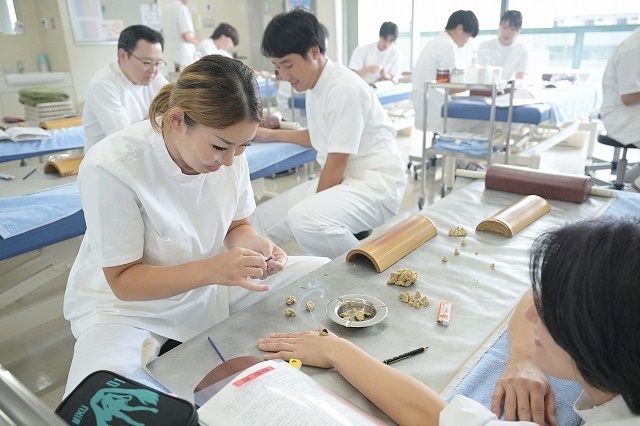 東京衛生学園の1年生が練習するお灸は、米粒大(こめつぶだい)の透熱灸と、母指頭大の知熱灸(ちねつきゅう)があります。そんな知熱灸の授業進行しております。