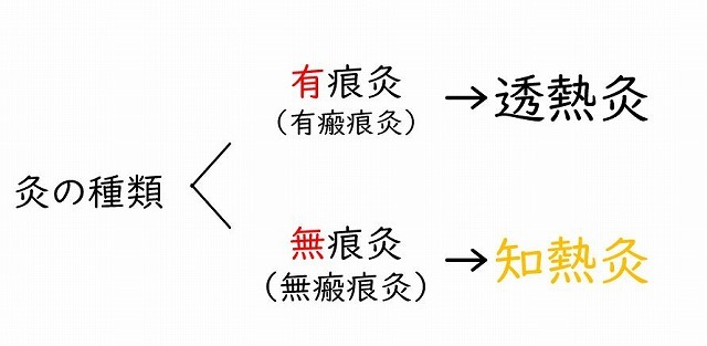 透熱灸は、現在の教科書ではお灸をした後に皮膚に火傷の痕(瘢痕)が残る「有痕灸(有瘢痕灸)」に分類されており、