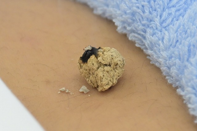 線香の火って、皮膚に近づけただけでも熱いので、線香の扱い方、つまり火をお灸に近づける時間や、灰をちゃんと払っているかなどが重要になってきます。下の写真にも灰が落ちているのがわかります。危険です。知熱灸の形もダメ。