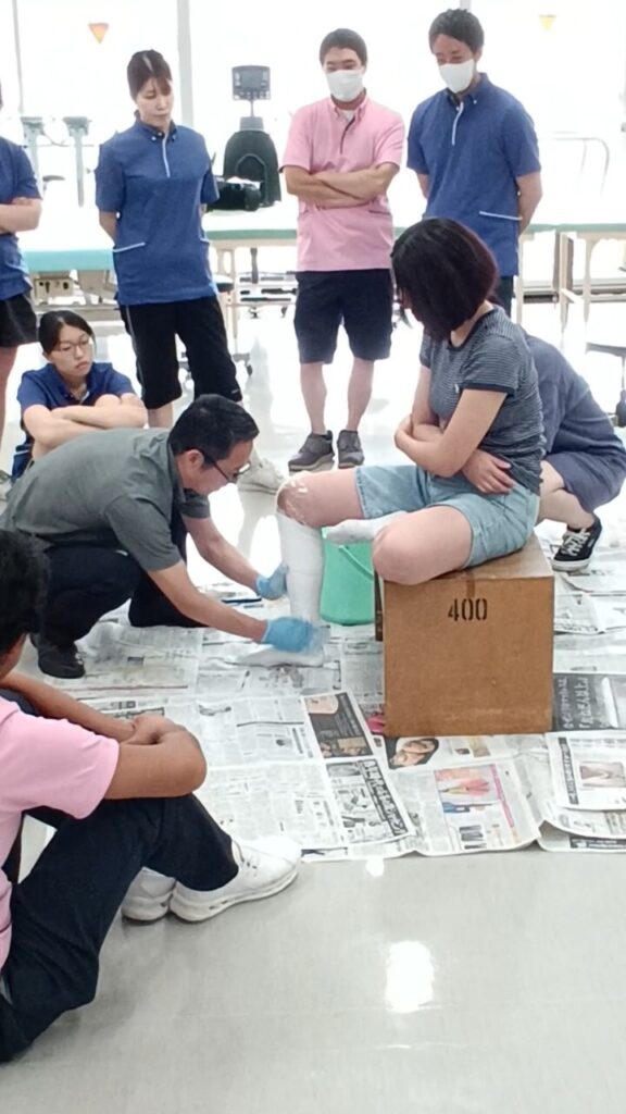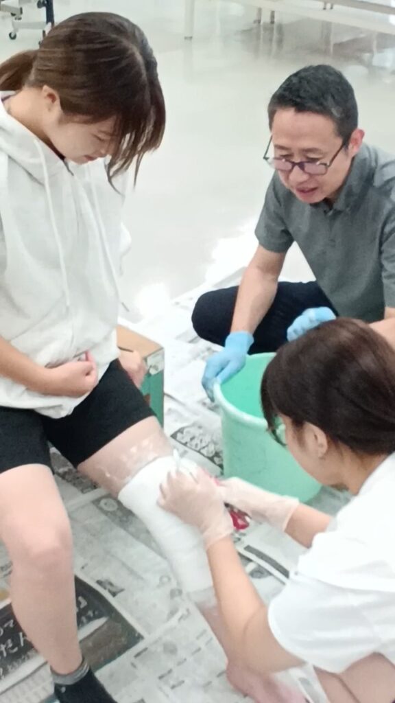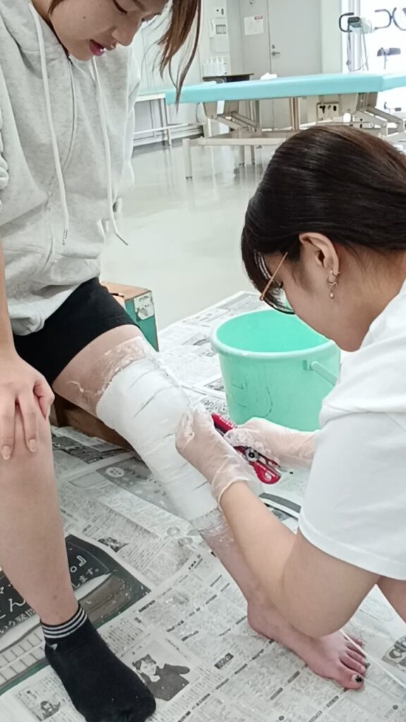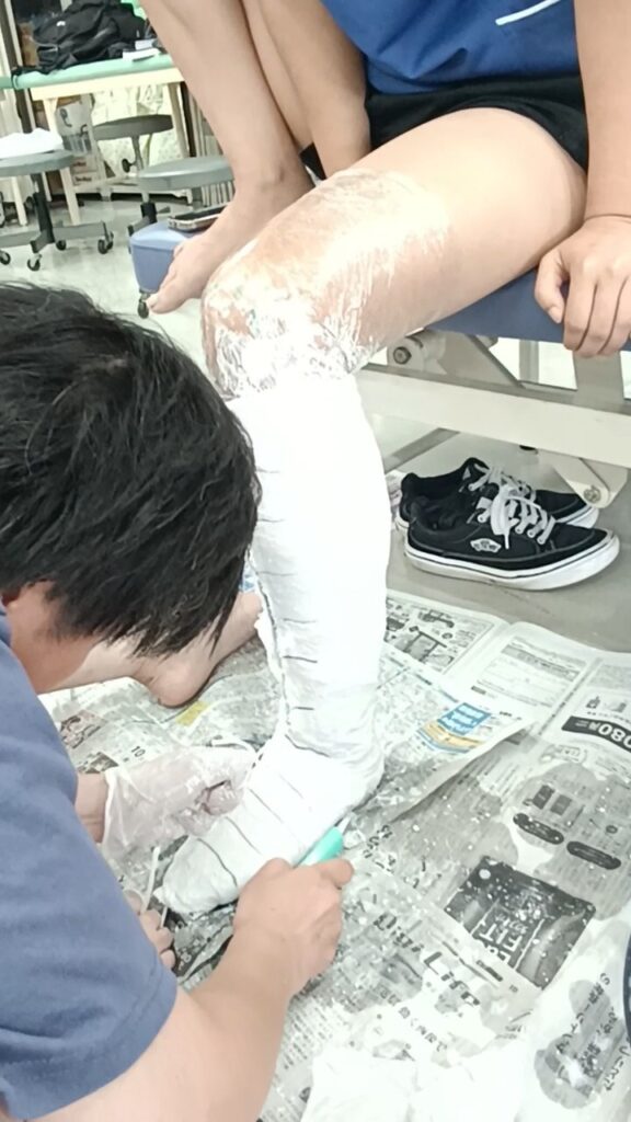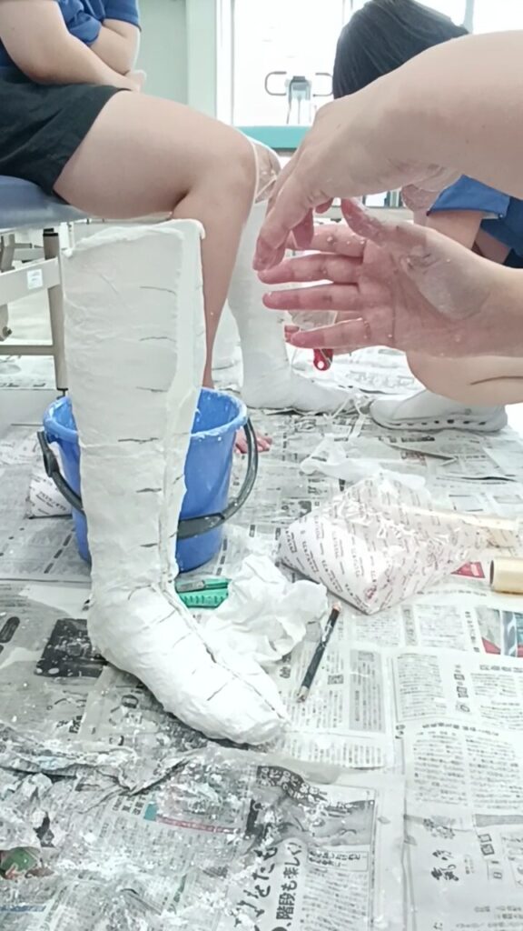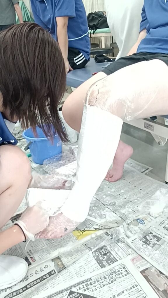 最初は難易度の低い膝の型取りで練習してから、本番の足の型取りに挑戦しました。