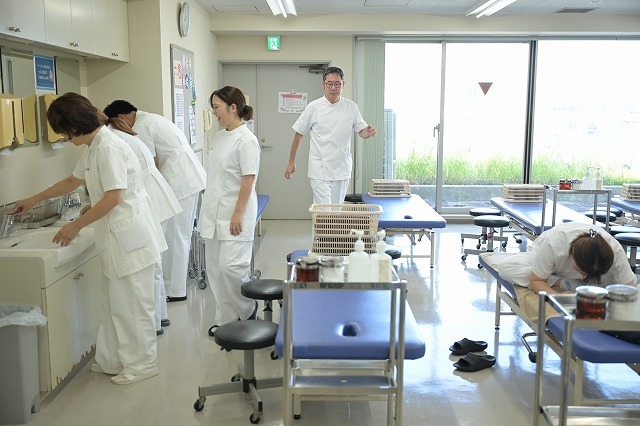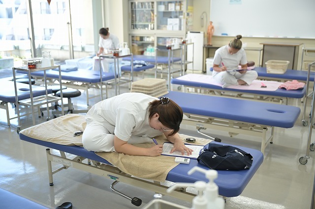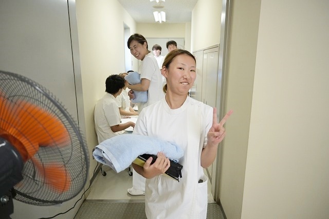 こんな感じで、「あん摩・マッサージ・指圧」試験では先生方が身をもって評価をしていきます。3年生の試験だとだいぶ上手になっていますが、1年生の試験の評価は、終わったあとに身体がしんどくなります(笑)。学校の先生は体力勝負なんですよ。