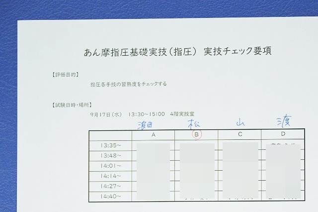 写真:こちらは学生さんに配られる「実技チェック要項」の一部です。学生さんの名前を消していますが、誰が何時から試験なのか、また試験内容などが記載されています。青字は試験官を担当した4名の先生です。すでに紹介した4名です。