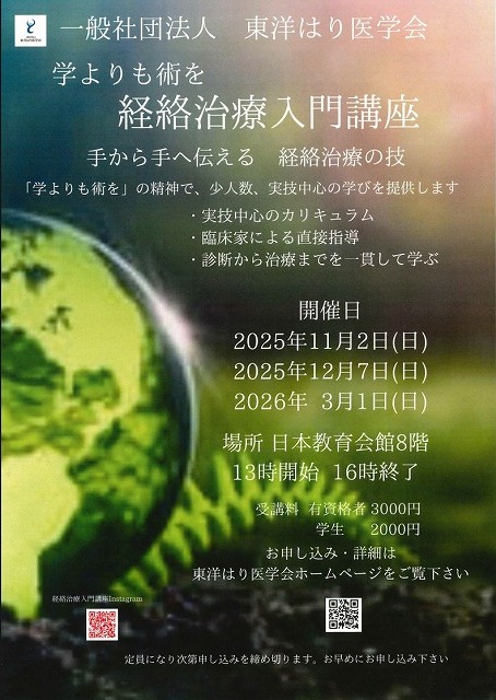 ジュンジさんの所属している「東洋はり医学会」で入門講座が開催されるとのことで、ポスター頂きました。
