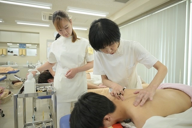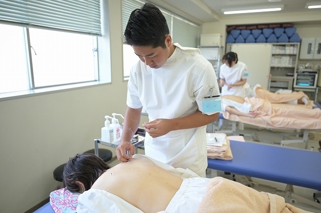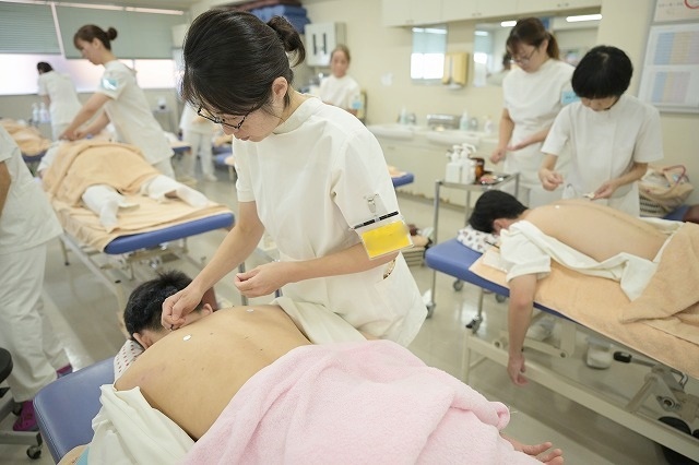 2年生の9月。肩にお灸をしているということは、いよいよ肩に鍼をするということ。もっとも刺すのが難しく、ほとんどの学校では刺さないツボたちに、東京衛生学園ではプロ同様刺せるようになっていだきます。