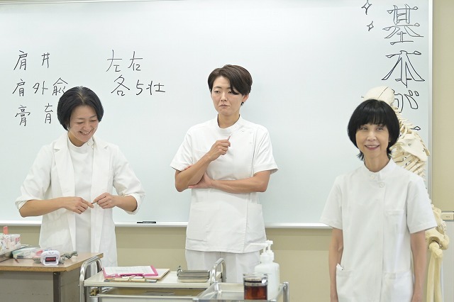 2年生の鍼灸基礎実技は、こちらの3人が目を光らせています。