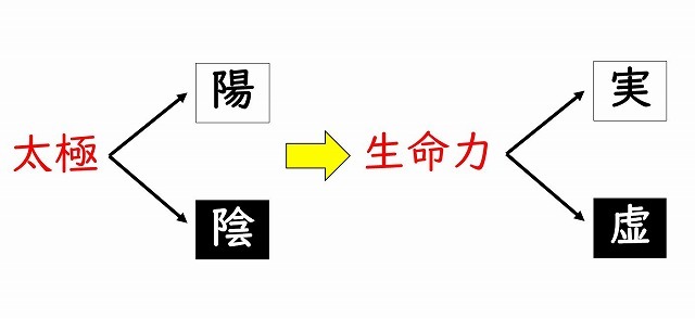 「気の思想」の次に重要になってくるのが「陰陽論」です。世の中のすべて、人の身体、これらが「気」で出来ているというだけでは、気の流れは説明が難しい。そこで用いられるのが「陰陽論」となります。ことなる二つの視点から気の状態を見ていくのに用いられます。たとえば、上と下、中と外。男と女などなど。東洋医学に応用すると、体の状態を表す「虚と実」で表現されます。積聚治療では、この「陰陽」の元である「太極」にも注目し、体の状態は「生命力」の状態と捉えます。