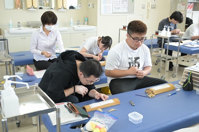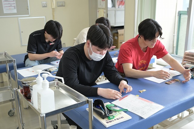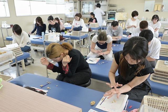 写真:みんな姿勢が凄いことになっているね(笑)。腰痛になるぞ。きゅう師のタマゴたち!