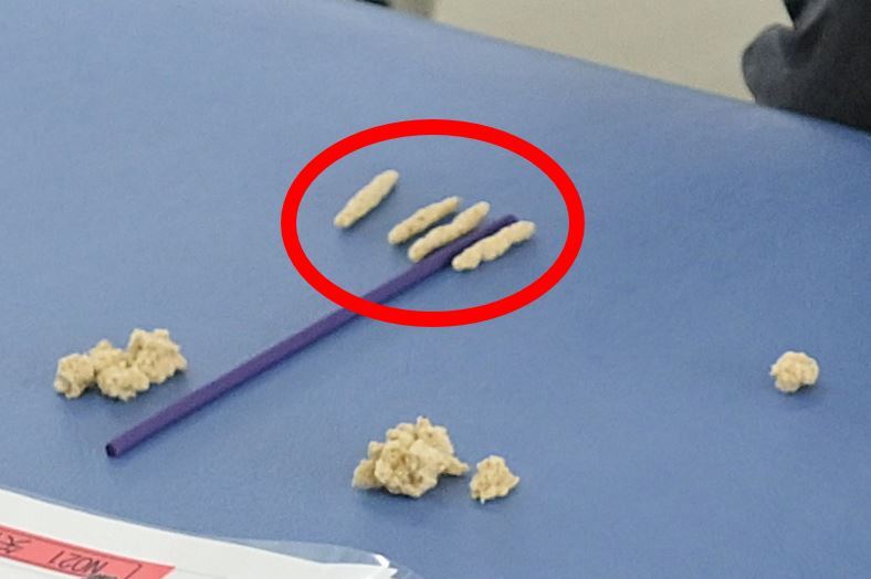 まずは、お灸を作る前段階である「小縒り(こより)」を作ります。艾を棒状にしたものです。写真左、アヤネがすでに完成しております。アップで見てみましょう。