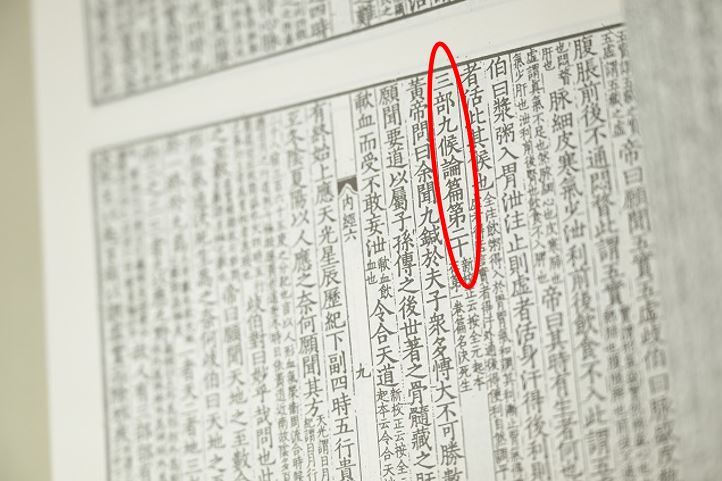 写真:『黄帝内経』素問の三部九候論篇第20。三部とは、頭顏首の人体上部、そして中部である腕、下部である足の三部を指しています。