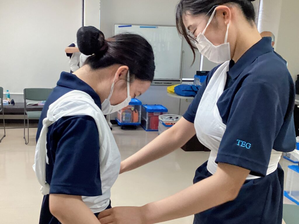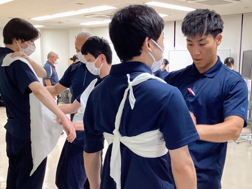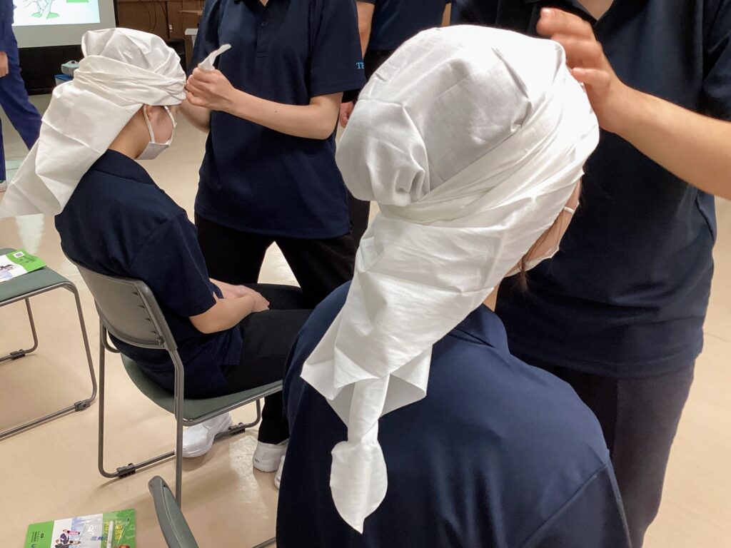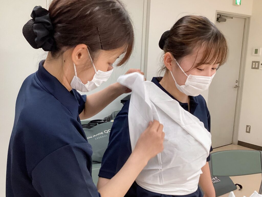 学生同士ペアになり、三角巾の使い方を学びます。