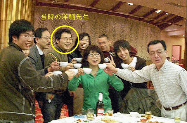 写真:この写真はその時の中国での夕食。なんと、この日が日本で国家試験の合否発表日というめでたい日。みんなおめでとう!って乾杯したところ。いい思い出です。あっ、洋輔先生の左が兵頭明先生、一番右が当時学科長の田山先生。
