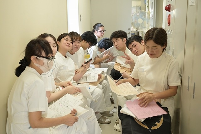 4階に降りたら実技室前でこんな感じ。この方々は2年生です(笑)。これから鍼灸の実技試験なのですが、名前を呼ばれるのを待っているところです。実技試験の待ち時間を利用して座学の試験勉強しているあたりが、真面目です。