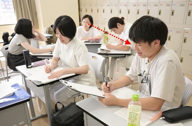 写真:臨床実習痕の反省会。施術時の記録を見て状況を思い出すケイタロウ。