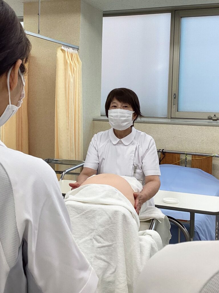 妊婦さんのおなかの模型「妊婦腹部触診モデル」を使って学習します。