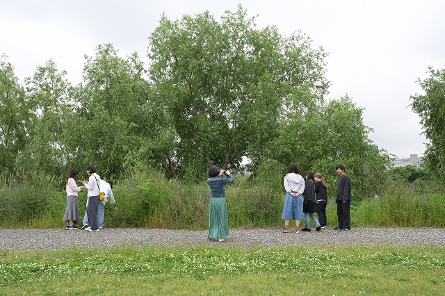 ヨモギ取りの1年生の写真を撮る田坂先生。