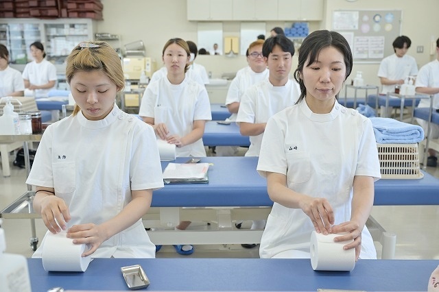 私が東京衛生学園で実技を指導し始めた数年は「糠枕」を作っていたのですが、作成難易度が意外と高く、精度にばらつきがあったので代わりになるものを考えていました。そこで閃いたのが「トイレットペーパー」でした。当時、入手可能なトイレットペーパーを10種類以上買って、鍼を刺し比べた結果、難易度的に鍼練習に適しているのを見つけることができ、かれこれ十数年、東京衛生学園では「糠枕」の代わりに「トイレットペーパー」を使用しています。