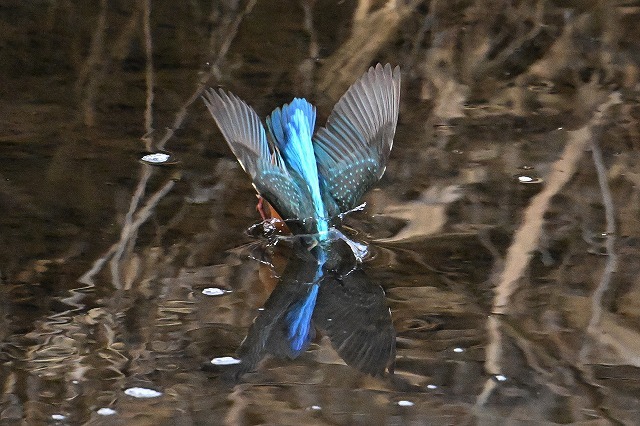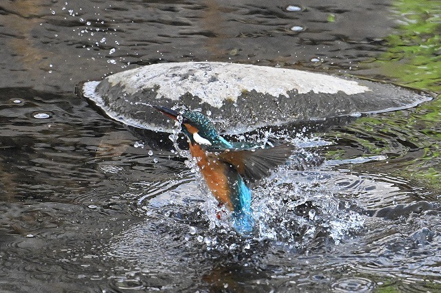 写真:これは飛び込む瞬間(「ダイブ」)を狙ったのですが失敗したものです。上手な方は、クチバシが水面に触れた瞬(間「水面キス」)になるのですが…。