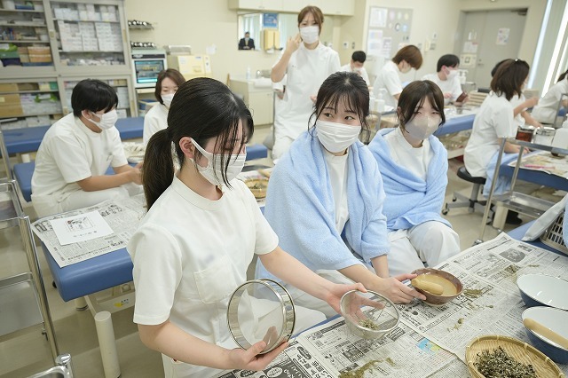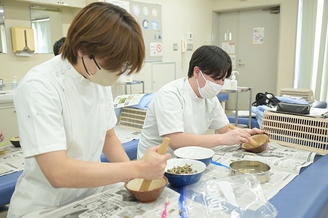 授業では知ることができない、艾屋さんならでは話が盛りだくさん。基礎知識を得て、艾作りをしていきます。蓬採りの時のメンバー(班)で艾を作ります。