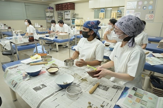 みんなマスクしているのは、作っている最中に粉が舞うからです。授業後に鼻をかむと鼻水がやや緑色に(笑)