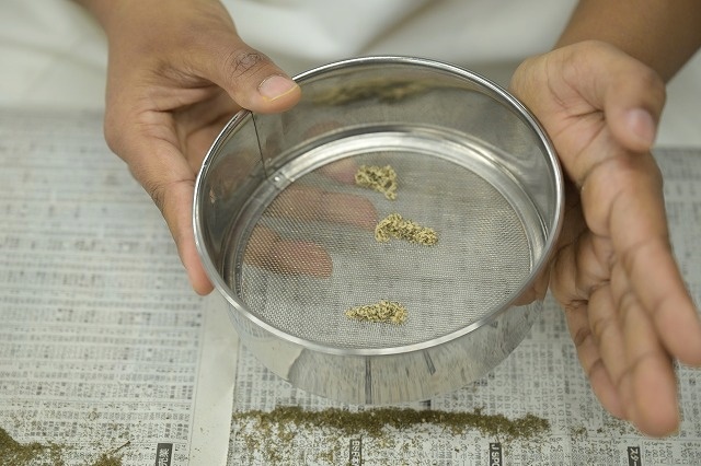 必要な道具は全て学校にそろっております。トモヨが艾を篩(ふるい)にかけています。