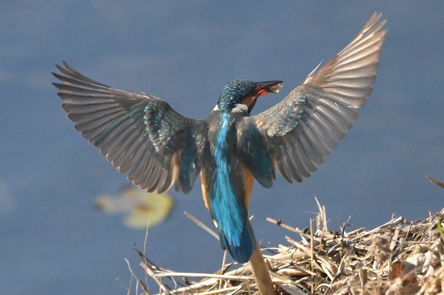 写真:小魚くわえて飛んできて枝に止まったところ。大きく羽を広げてくれました。ちなみに、撮影はカメラを「手持ち」」で撮影していましたが、すぐに限界を感じて「一脚」を使用しております。そうそう道具(機材)も増えました。お金も使いました(笑)