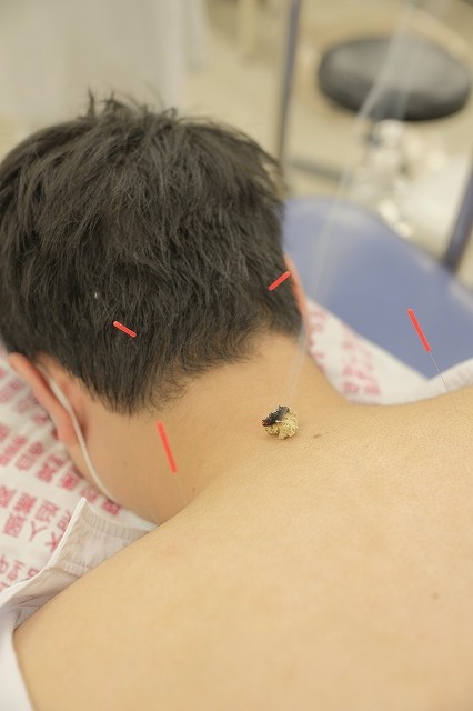うつ伏せでは、天柱と風門に刺鍼しながら大椎に知熱灸をしています。