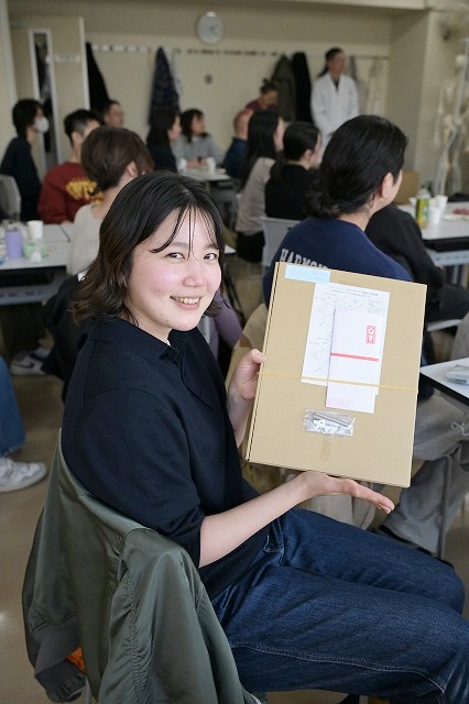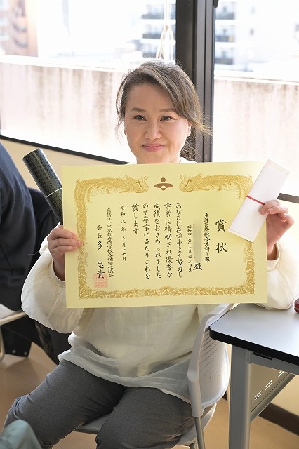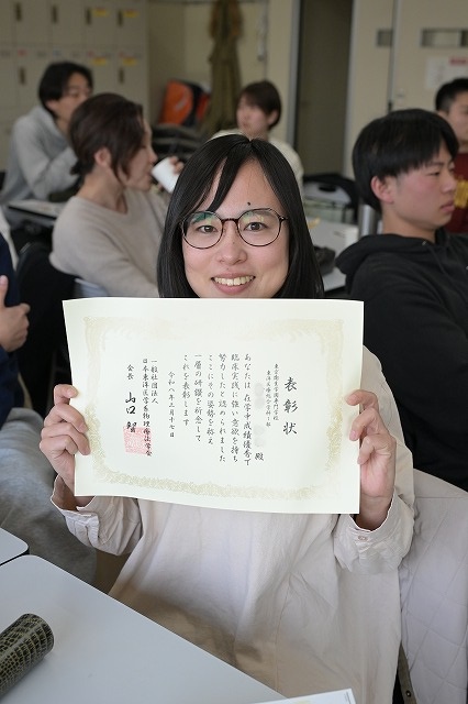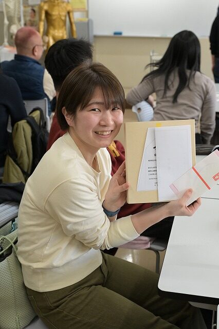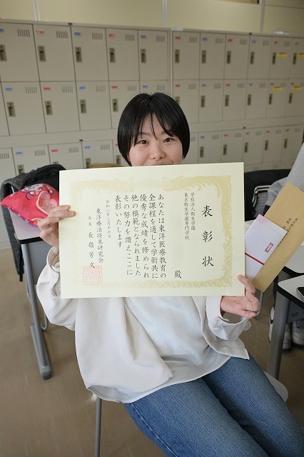 そしてそして、ユッキーにはもう1つ表彰が。本校で主に使用している亀屋佐京商店さんの艾ですが、その亀屋さんから「亀屋もぐさ賞」(亀屋さんの最高級もぐさが授与されました。これは3年間のお灸の成績で選ばれます。学も術も頑張りました。