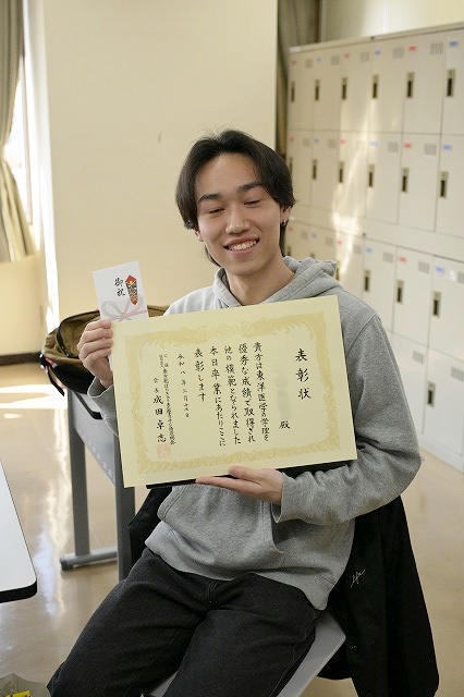 で、この日は学校関係から卒業を祝って贈られてきた記念品等の授与もおこないます。HD34期で3年間成績優秀だったのはダイチでした!頑張った。なんか立たされているみたい(笑)。あっ、ダイチは翌日の卒業式で表彰されます。