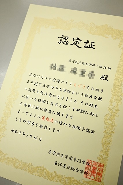 最終登校日に全員に授与されるのが、お灸の「認定証」です。文面を読み上げると、「貴殿は日々の宿題としてもぐさをひねり 三年間で三万七千七百壮という膨大な数の施灸を積み重ねてきました その指先に宿った技術と自己を律して研鑽に励んだ姿勢は誠に称賛に値します よってここに透熱灸の確かな技術を認定しその努力を顕彰します 令和8年3月16日 東京衛生学園専門学校 東洋医療総合学科」です。