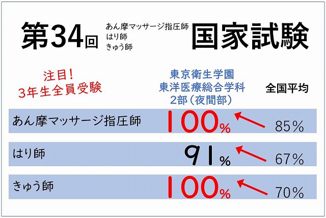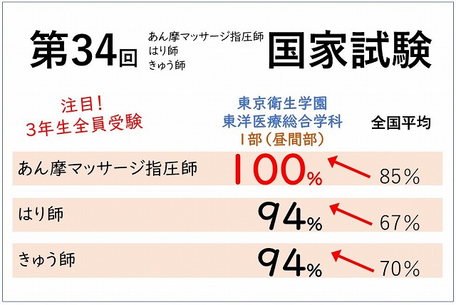先月末に行われた、3年生にとって最大のイベントである国家試験の結果がでました。東京衛生学園専門学校の結果はこのようになっております。