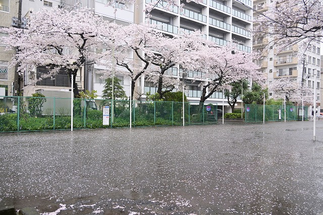 写真:雨の為、桜吹雪になっていませんが、地面には満遍なく花びらが落ちています。新入生の登校日までもつかなー。
