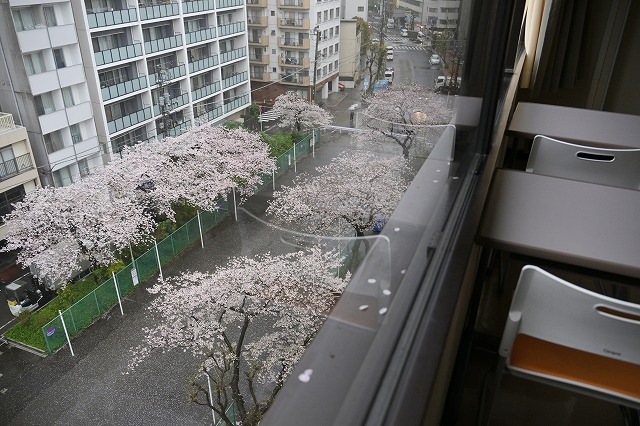 写真:7階の教室から見たグリーンベルトの桜。本日の雨で少しだけ散っています。