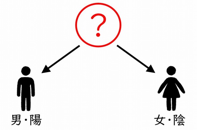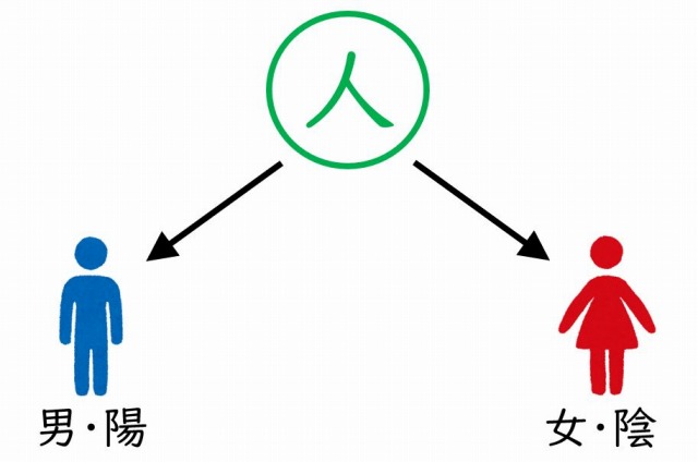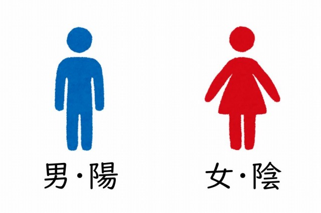 例えば、「陰陽論」の例で用いられるのに男と女があります。男は家の外(陽)で狩りをして、女は家の内(陰)を守る。生殖器の形も男は凸で外(陽)に向かって出ていますし、女は凹で内(陰)に向かってへこんでいます。