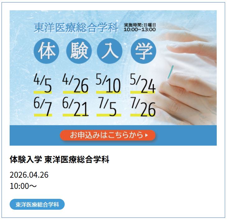 最後に「体験入学」のお知らせです。東京衛生学園専門学校で我々と鍼灸マッサージを学んでみたいという学希望者みなさん、是非「体験入学」に足を運んでみてください!