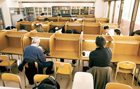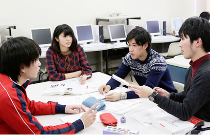 インターネット、プリンタに接続したパソコンが利用できる自習室です。大きい机や自販機もあるので、仲間同士リラックスした雰囲気で自習できるのも魅力。他学科の学生に勉強を教えてもらうこともあります。