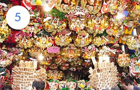 11月に開かれる「酉の市」。色鮮やかな熊手(かっこめ)がずらりと並んで、ほんとにキレイ!商店街を埋め尽くす露店は大賑わい。毎年楽しみにしています。