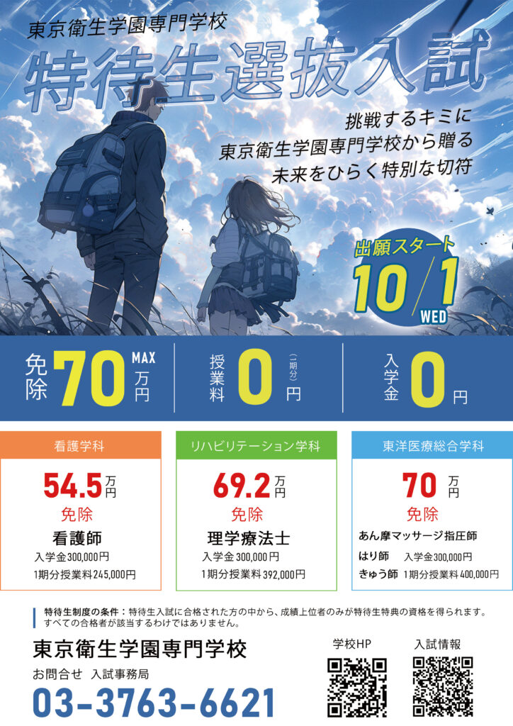 東京衛生学園専門学校では、昨年より「特待生選抜入試制度」を導入いたしました。