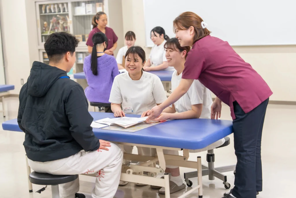 本校の実技内容は、治療院勤務はもちろん、美容、スポーツ、そして開業にも対応できる3年間の徹底した基礎実技と、どの分野でも対応できる応用技術を学んでいきます。
