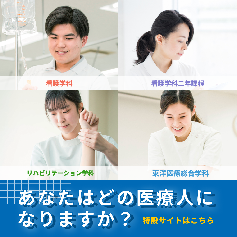 理学療法士をめざすリハビリテーション学科、鍼灸あん摩マッサージ指圧師をめざす東洋医療総合学科、看護師をめざす看護学科。いずれも3年間で国家試験の受験資格を得ることができます。また、本校の卒業と同時に専門士(医療専門課程)の称号が付与されます。