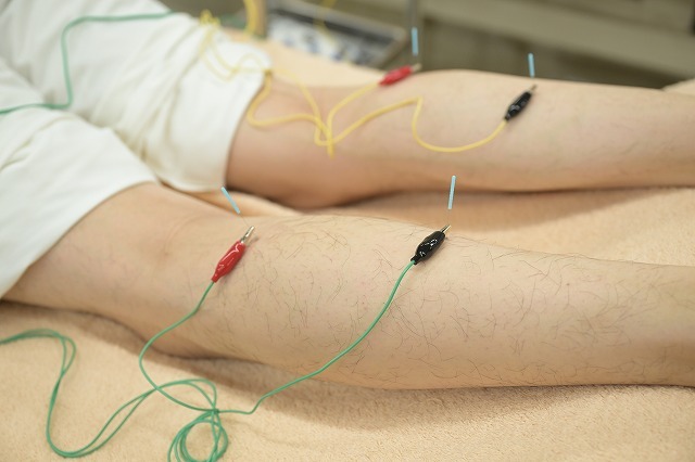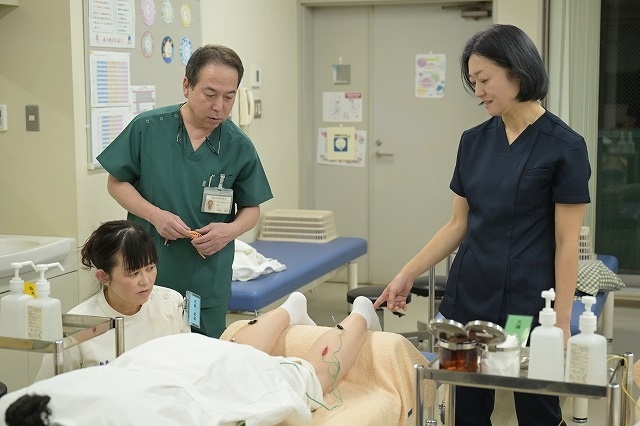 田坂里織先生が、鍼の深さを調整しています。鍼通電療法では、目的の筋肉にしっかり鍼が刺さった状態で通電すると、筋肉が反応してピクピク動きますからね。ちなみに、東京衛生学園の学生さんはもちろんのこと、卒業生も知らないと思いますが、田坂里織先生は鍼通電療法を専門にやっていた鍼灸学校の卒業生ですので、得意です。