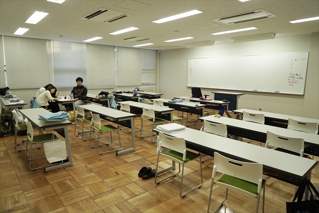 放課後教室覗いてみた(笑)。神奈川衛生学園専門学校の教室はこんな感じ。長机なんだねー。そして椅子が今時って感じ。