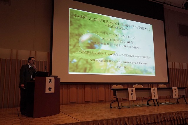 全日本鍼灸学会は、鍼灸学術団体として我が国唯一の法人格を持つ日本を代表する鍼灸学の学術団体です。会員数は約5,000名で、はり師・きゅう師をはじめ、医師、歯科医師、そしえ医科学等の研究者などの鍼灸医学に関心を持つ人達で構成されています。本校の教員もこれまで多くの研究発表などをしてきました。私もシンポジストとして発表したこともあるんですよ。今回は、兵頭所長が「フレイル予防と鍼灸~超高齢社会に対する鍼灸師の意義~」としてパネルディスカッションで発表されました。