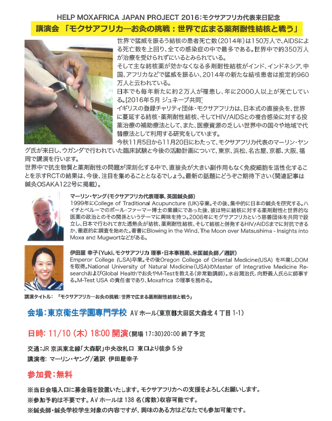 講演会 「モクサアフリカ―お灸の挑戦:世界で広まる薬剤耐性結核と戦う」