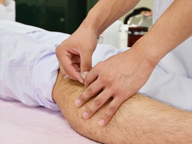 写真:はい!上手にできましたー。鍼の先が皮膚に垂直ではなく、足首のほうを向けてます。