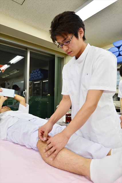 でー、いきなりそんな危険な部位での練習はできませんので、比較的安全な膝の下あたりで斜刺の練習をおこない、斜刺が『完璧』にできる状態で、比較的危険な部位での刺鍼練習に入っていきます。具体的には2年生の夏休み明けから。つまり、それまで徹底的に斜刺の練習をすることになります。1年生から2年生への進級にかかわる実技試験の内容にも、この『斜刺』が入ってきます。