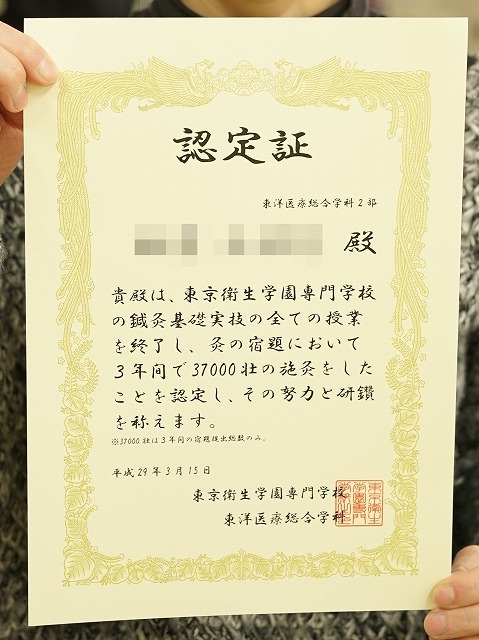 サキベーが持っているのは、東洋療法学校協会による実技試験の認定証。いわゆる学外の評価だね。