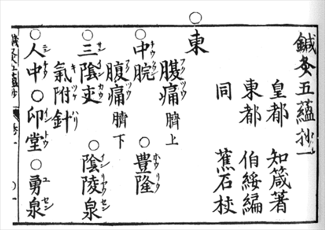 写真:鍼灸五蘊抄(『臨床鍼灸古典全書1』オリエント出版より)の中身を少しだけ見てみるとこんな感じ。腹痛とツボとして、中、豊隆、三陰交、陰陵泉が紹介されているが、腹痛を臍の上下で分けている。腹の字もよーく見るとそれぞれ違うでしょ。